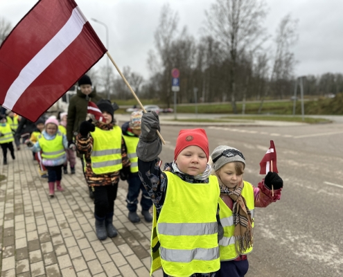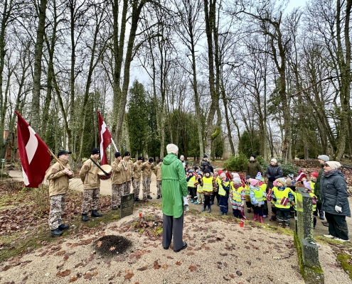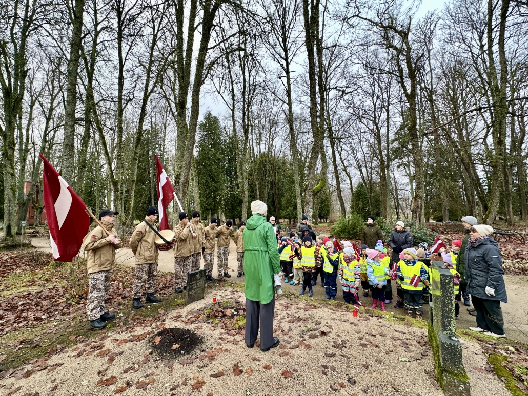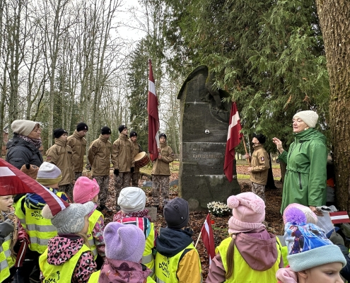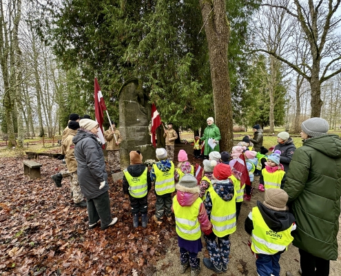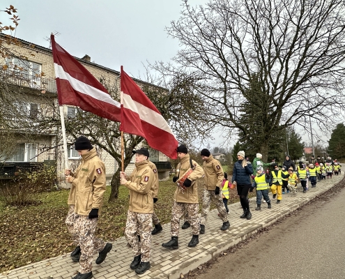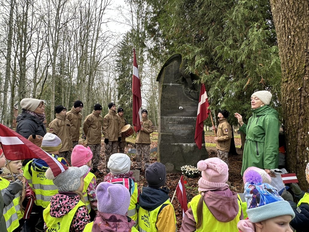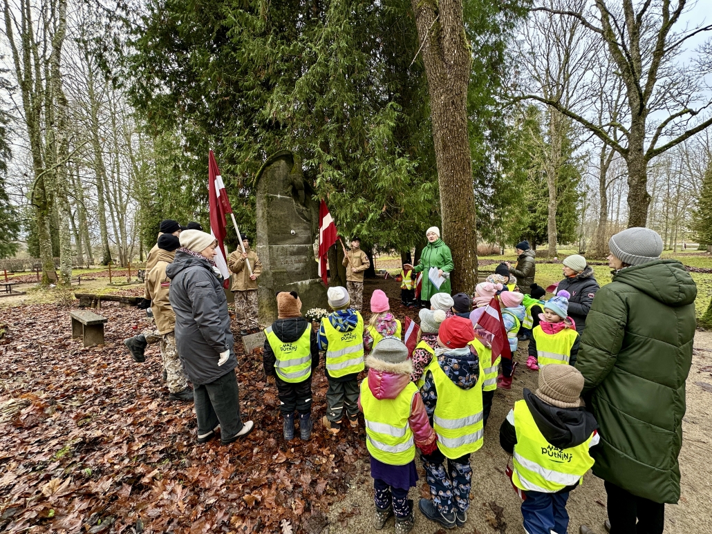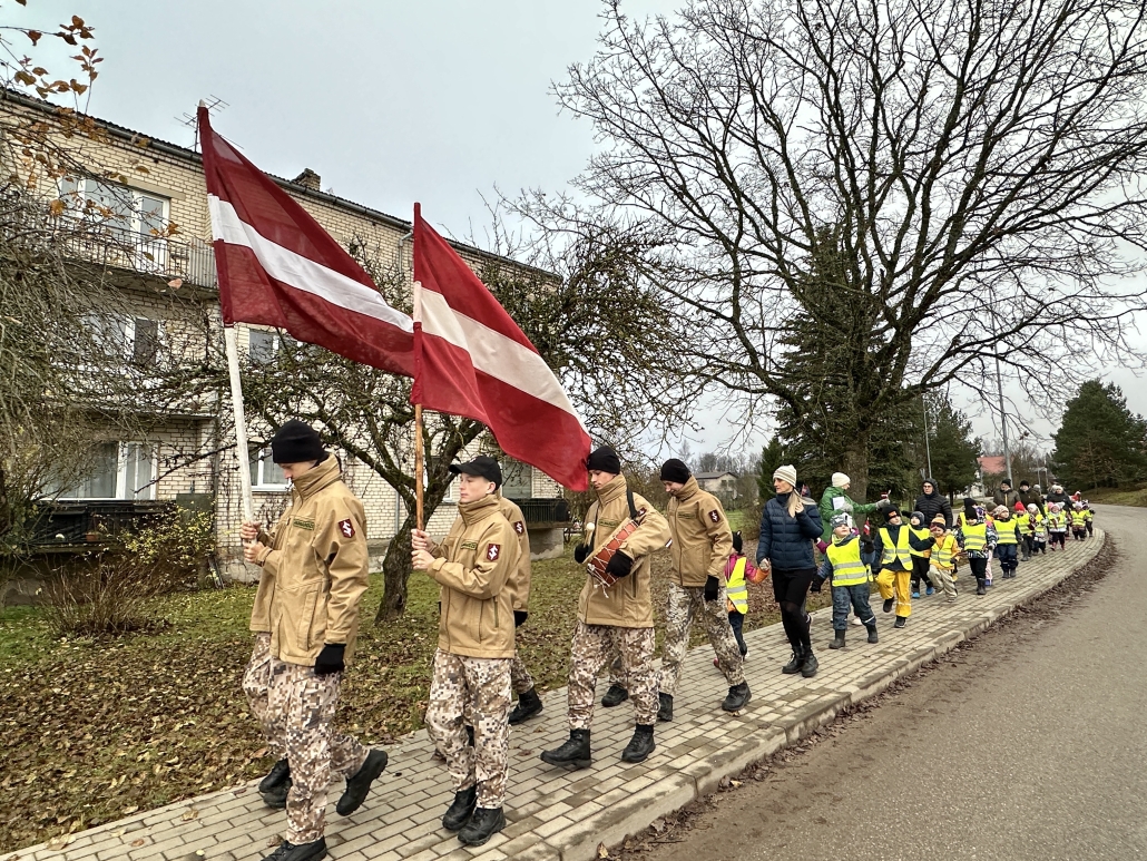 Vecpiebalgas vidusskolas jaunsargi rādīja mazākajiem- bērnudārzniekiem labu paraugu ar stāju un attieksmi pret karogu, pret himnu, pret biedriem. Skanot “Karoga dziesmai” no rokas rokā ceļoja divi sarkanbaltsarkanie karogi, sakot paldies pagātnes varoņiem un šodienas jaunsargiem, zemessargiem, armijas kareivjiem, dižkareivjiem, instruktoriem un virsniekiem. Nosūtījām video sveicienu mūsu bērnudārza un skolas bijušajiem audzēkņiem, tagad Latvijas armijas virsniekiem Kristeram un Gatim Slavēniem. Karogiem plīvojot devāmies uz kapiem, kur atdusas vairāki Lāčplēša Kara ordeņa kavalieri: Kārlis Caune, Jānis Raibais, Emīls Venskis un citi. Lai pieminētu un noliktu svecītes, piestājām pie zemessarga, Almas un Alberta tēta kapiņa. Nodziedājām arī “Div’ dūjiņas gaisā skrēja”. Jaunākie bērnudārza bērni devās uz skolu pie sveču sienas. Noslēgumā visus gaidīja ugunskurs un maizītes cepšana uz iesmiem. Gluži kā karavīriem ierakumos, mežā, vēsumā. Tikai mēs, bērni un pieaugušie, te, Vecpiebalgā, drošībā un zem mierīgām debesīm.