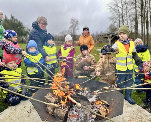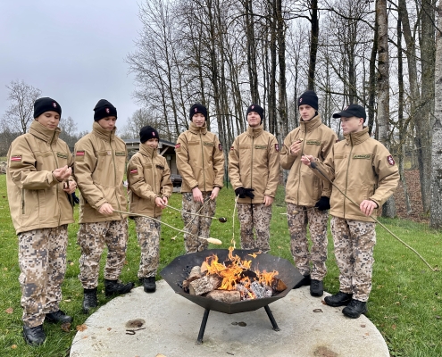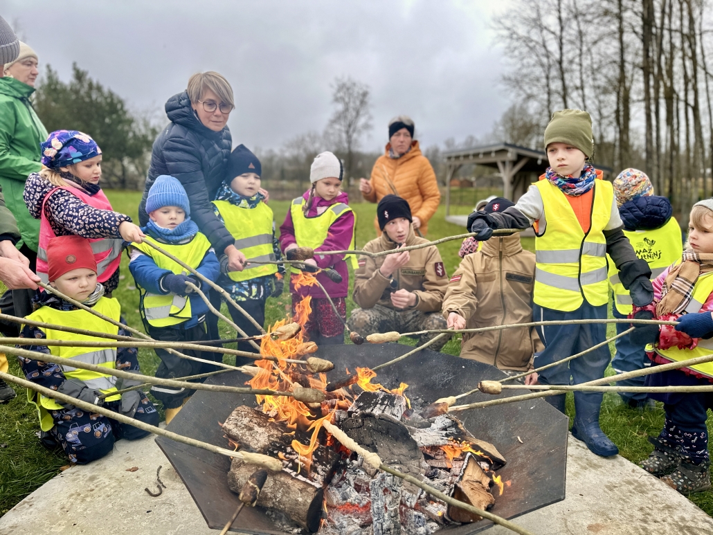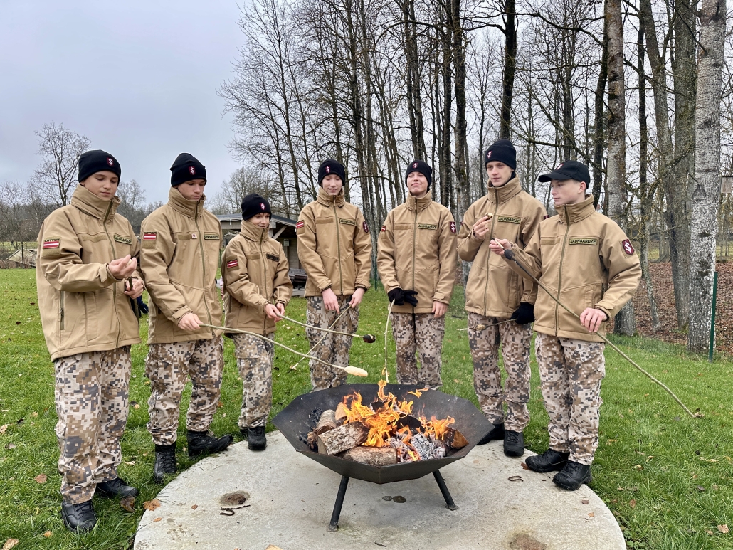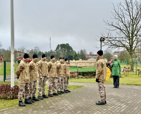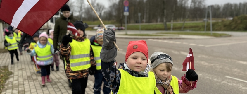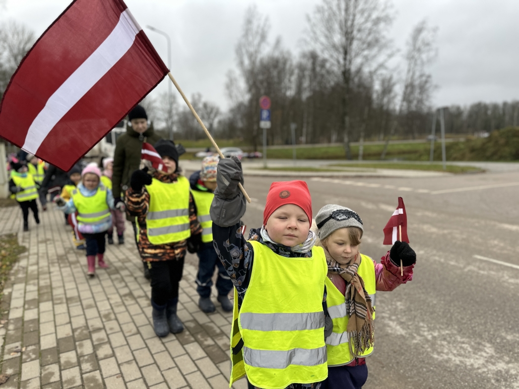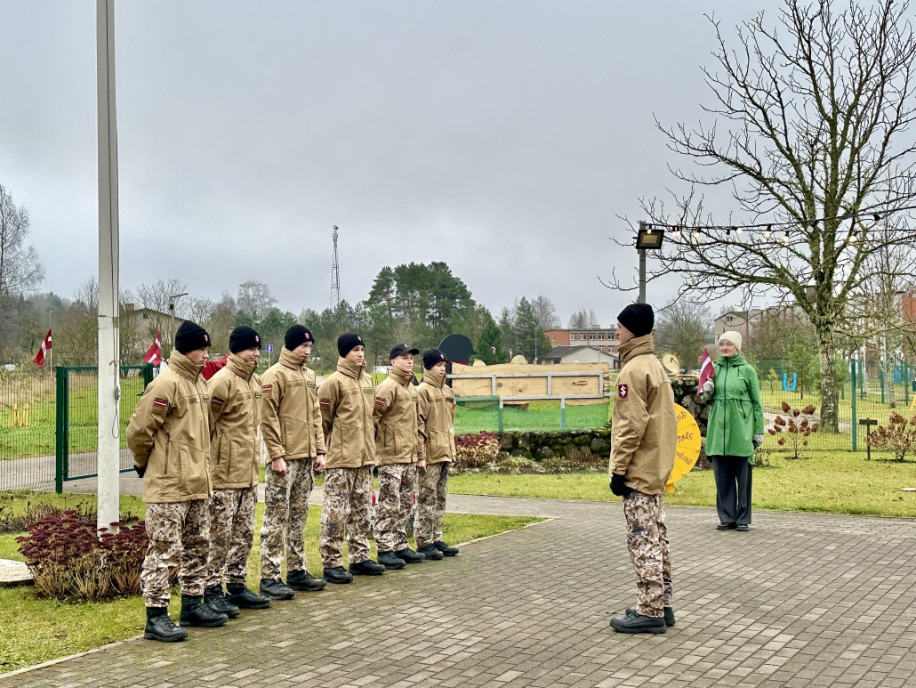 Vecpiebalgas vidusskolas jaunsargi rādīja mazākajiem- bērnudārzniekiem labu paraugu ar stāju un attieksmi pret karogu, pret himnu, pret biedriem. Skanot “Karoga dziesmai” no rokas rokā ceļoja divi sarkanbaltsarkanie karogi, sakot paldies pagātnes varoņiem un šodienas jaunsargiem, zemessargiem, armijas kareivjiem, dižkareivjiem, instruktoriem un virsniekiem. Nosūtījām video sveicienu mūsu bērnudārza un skolas bijušajiem audzēkņiem, tagad Latvijas armijas virsniekiem Kristeram un Gatim Slavēniem. Karogiem plīvojot devāmies uz kapiem, kur atdusas vairāki Lāčplēša Kara ordeņa kavalieri: Kārlis Caune, Jānis Raibais, Emīls Venskis un citi. Lai pieminētu un noliktu svecītes, piestājām pie zemessarga, Almas un Alberta tēta kapiņa. Nodziedājām arī “Div’ dūjiņas gaisā skrēja”. Jaunākie bērnudārza bērni devās uz skolu pie sveču sienas. Noslēgumā visus gaidīja ugunskurs un maizītes cepšana uz iesmiem. Gluži kā karavīriem ierakumos, mežā, vēsumā. Tikai mēs, bērni un pieaugušie, te, Vecpiebalgā, drošībā un zem mierīgām debesīm.