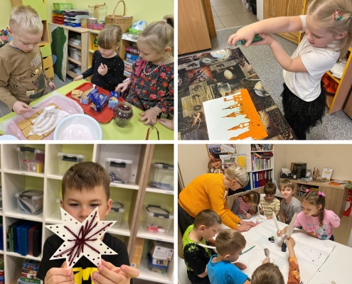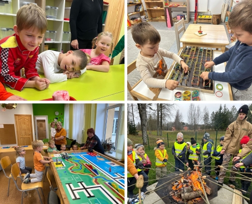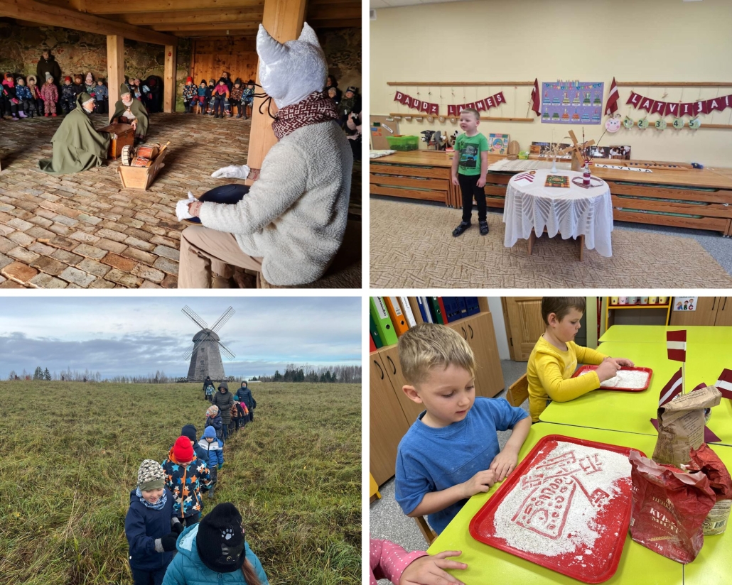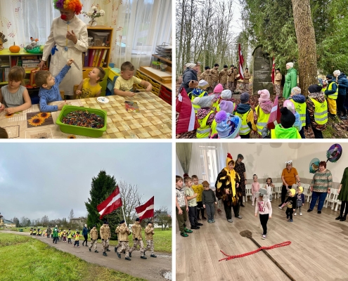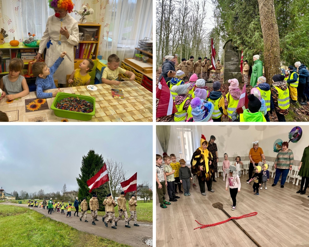 Lai gan daudzkārt dzirdēts, ka novembris esot drūms un tumšs, šķiet, ka dažnedažādu svētku tajā ir pat vairāk, kā citos gada mēnešos. Novembrī svinējām Mārtiņus un spokojāmies Helovīnos. Godinājām jaunsargus, zemessargus un kritušos varoņus Lāčplēša dienā. Svinējām Latvijas 107.dzimšanas dienu. Svinējām arī ziemu! Vai nav lieliski, ka var novembrī jau slēpot?! Veselu nedēļu mācījāmies, kā jācīnās ar mikrobiem, lai beigās varētu priecāties kopā ar dakteri Klaunu un Mikrobu Mikrobiusu. Paši lielākie- “Pūces skolas” grupiņas bērni devās uz atkritumu poligonu Daibē. Oi, oi, oi, tur gan pavērās bēdīgs skats! Tik daudz atkritumu! Mums ir skaidrs, ka jādomā plāns, kā likt tos lietā, vai kā iznīcināt, lai nenodarītu pāri dabai. Labi, ka tur satika Skudru Urdu, kura pastāstīja, kas jau tiek darīts, lai savaldītu atkritumu jūru. Novembrī, gluži kā citos mēnešos, ir daudz iemeslu priekam!