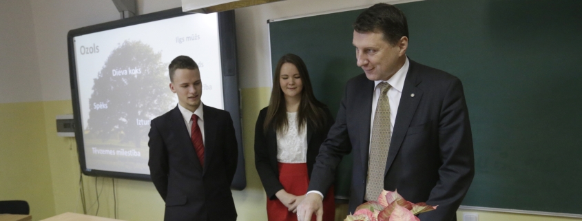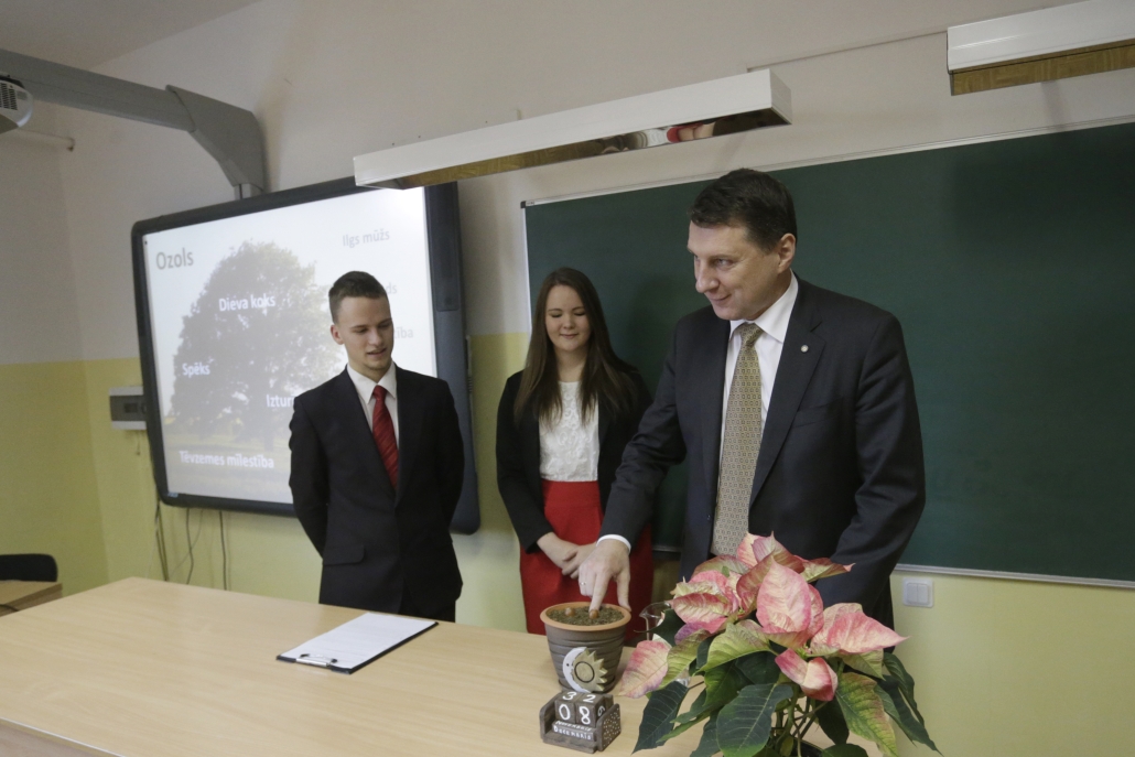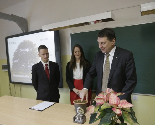 Savukārt 2015.gada 8.decembrī skolu apmeklēja Latvijas Valsts prezidents Raimonds Vējonis ar kundzi Ivetu Vējoni. Ar prezidentu vispirms tikās Izglītojamo pašpārvalde (vadītāja Maira Asare un vietnieks Jēkabs Zommers), klašu vecākie un skolas direktore Lolita Žagare. Teikdams spēka vārdus, prezidents podiņā iestādīja 3 ozolzīles. Aktu zālē prezidents teica uzrunu un atbildēja uz skolēnu jautājumiem. Atvadoties prezidents novēlēja: “Lai spējam viens otrā labāk ieklausīties un teikt cits citam labus vārdus!” 2017.gada 1.septembrī no zīles izdīgušais ozoliņš tika iestādīts pie Absolventu alejas.
