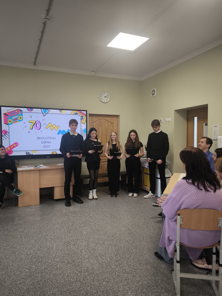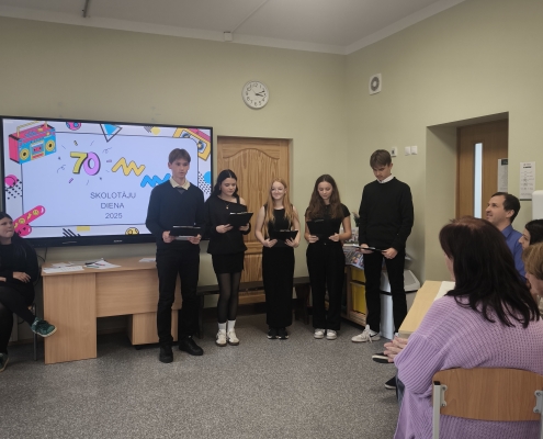 Pirmdien, 6. oktobrī mūsu skolā norisinājās skolotāju dienas pasākums. Skolotājus no rīt skolas foajē sagaidīja 8. klases puiši, pasniedzot apsveikumu un nelielu saldumiņu – kā jauku dienas sākumu un pateicības zīmi par skolotāju ieguldīto darbu.