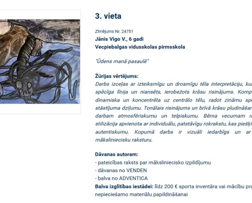 “Mazputniņa” bērni aug radoši un, rau, ir jau gana prasmīgi! Tādu novērtējumu sniegusi “Venden” zīmējumu konkursa žūrija: Latvijas Mākslinieku savienības biedri un Baldones Mākslas skolas pedagogi Tālivaldis Muzikants un Ieva Muzikante, piešķirot 3.vietu “Pūces skolas” audzēknim Jānim Vigo Vozņesenskim, bet pateicības rakstus par māksliniecisko izpildījumu Ellai Vērzemniecei un Oto Šulcam. Mazie mākslinieki saņems atzinības rakstus un balvas, kā arī “Mazputniņš” var izvēlēties mācību materiālus vai sporta inventāru 200 eiro vērtībā. Apsveicam bērnus un priecājamies par novērtējumu!